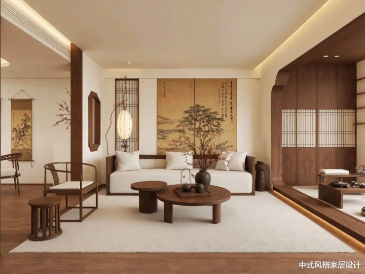 客厅,整体以原木色为基调,融合传统韵味与现代简约。浅灰色布艺沙发搭配圆形茶几,茶几上点缀陶罐与绿植。木质圈椅与小几错落摆放,墙面悬挂水墨山水画与书法卷轴。格栅屏风与矮榻组合,地面铺浅色地毯,顶部嵌入式灯带勾勒轮廓。通过线条、留白与自然材质的运用,营造出雅致内敛的东方美学氛围。