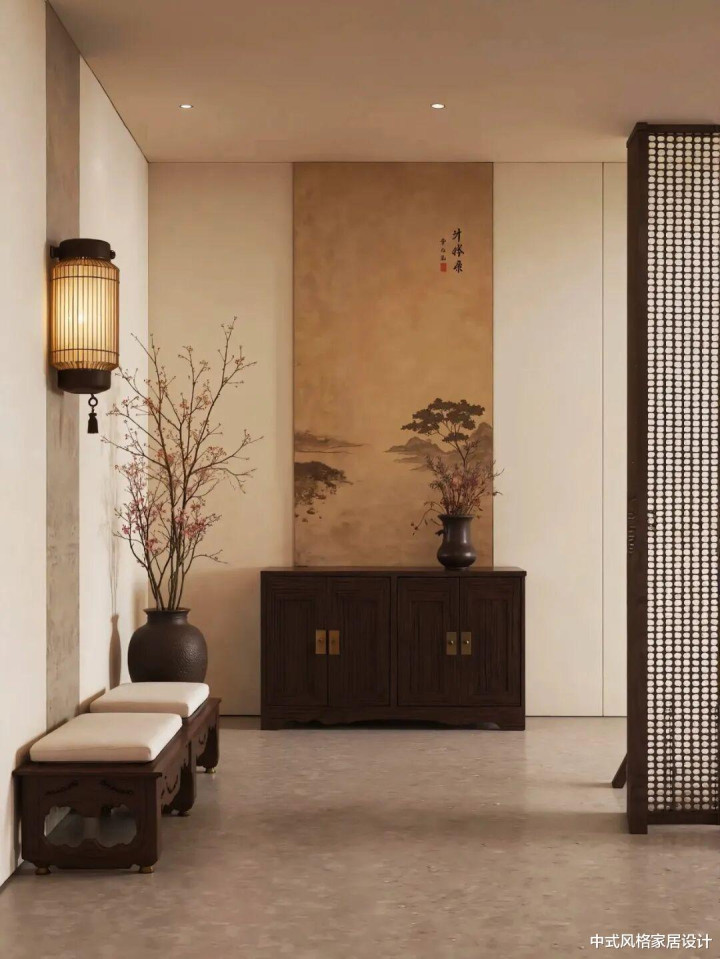 玄关,整体以米白墙面为底,搭配浅灰地砖,营造素雅沉静氛围。深色实木端景台,台面置古朴陶瓶与遒劲枯枝,上方悬挂水墨山水图,题字“松风煮茗”增添文人意趣;左侧设木质长凳,旁挂竹编灯笼,暖光透过竹篾洒落;尽头以镂空格栅屏风半隔空间,光影斑驳间尽显中式美学的含蓄与雅致。