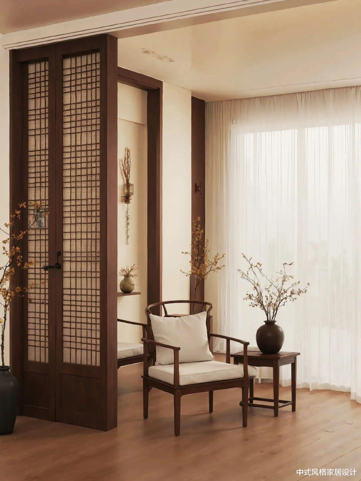 客厅阳台,整体以原木色为基调,融合传统韵味与现代简约。左侧为深棕色实木格栅屏风,竖条纹镂空设计,搭配同色系实木门框,门旁置简约花几,上插干枯芦苇。落地窗采用浅色纱帘,自然光透过形成柔和光影;窗下设圈椅与小几,椅上米色靠垫,几上陶罐插细枝,地面为温润木地板。空间通过格栅、陶罐、干花等元素,营造出修身养性的东方意境,兼具传统美学与现代居住舒适感。