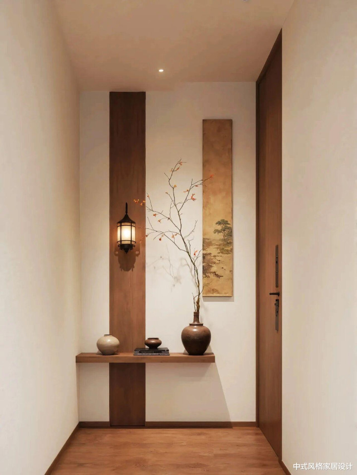 走廊,以原木为基调,融合国风古韵。墙面左侧为竖条纹木饰板,右侧悬挂水墨山水挂画,地面铺浅色实木地板。中央木质矮几上,粗陶花瓶插有疏朗枯枝,旁置小巧陶罐与茶具,上方壁灯散发暖黄光晕。整体设计简约温润,线条利落,通过原木肌理、水墨意境与枯枝禅意,营造出“少即是多”的东方美学氛围。