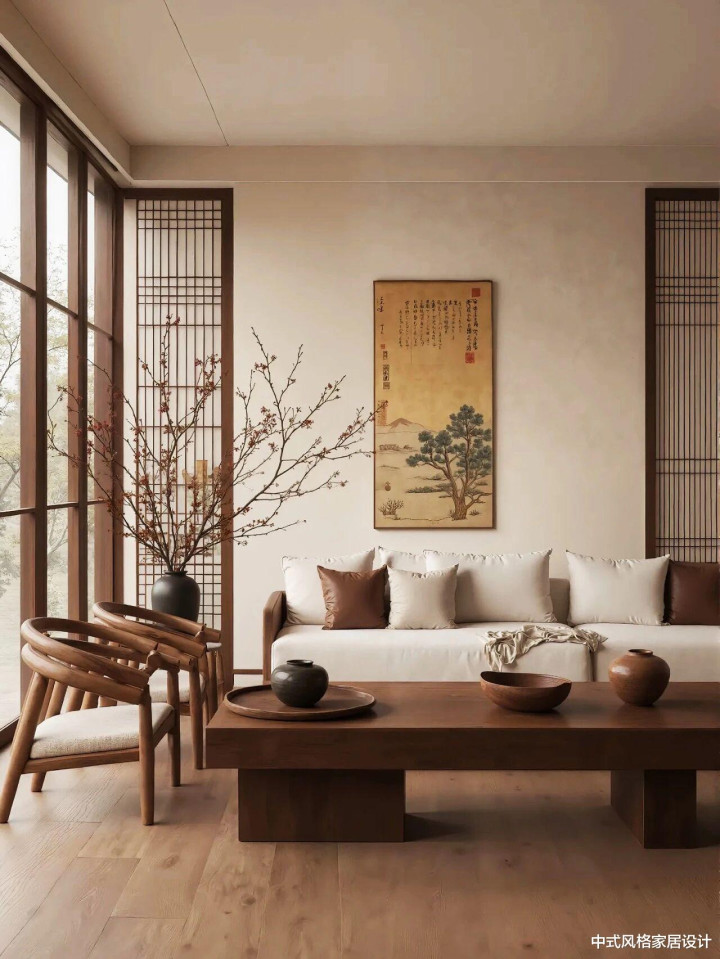 宋式美学的客厅整体呈现简约雅致的东方韵味。浅米色墙面搭配原木色地板,色调温润素净。中央设低矮实木茶几,上置黑陶茶具与陶碗;后方为米白布艺沙发,搭配深棕靠垫,线条利落。两侧立竖条纹木质屏风,透光不透视;窗边花几上,枯枝梅瓶斜插枝干,枝头几点红梅。墙面悬挂水墨山水挂画,题字与远山近树相映。阳光透过格栅窗在地面投下斑驳光影,营造出千年风雅的宋式禅意氛围。