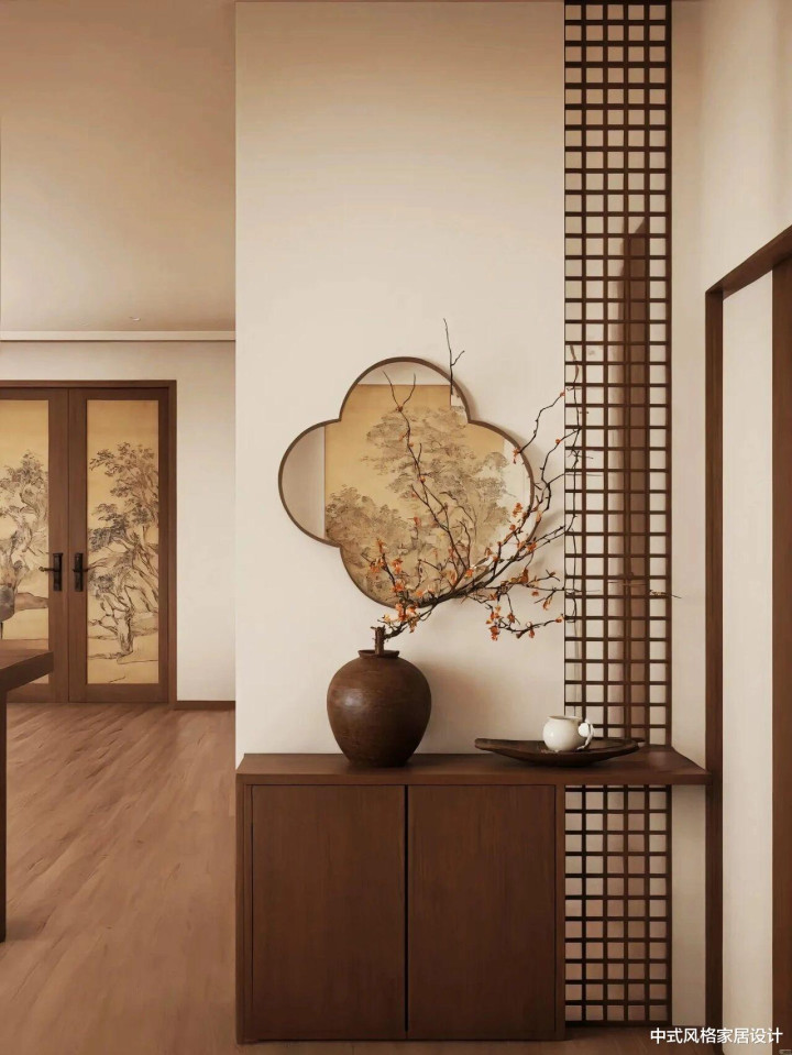 双开木门嵌山水纹样,门框线条利落;竖条纹木质格栅半透隔断,光影斑驳;深棕色实木柜,柜面置粗陶花瓶(插枯枝)、圆形托盘(盛素雅茶杯);墙面悬挂四叶草形水墨挂画,枝干疏朗,与枯枝花艺呼应,尽显东方美学含蓄意境。